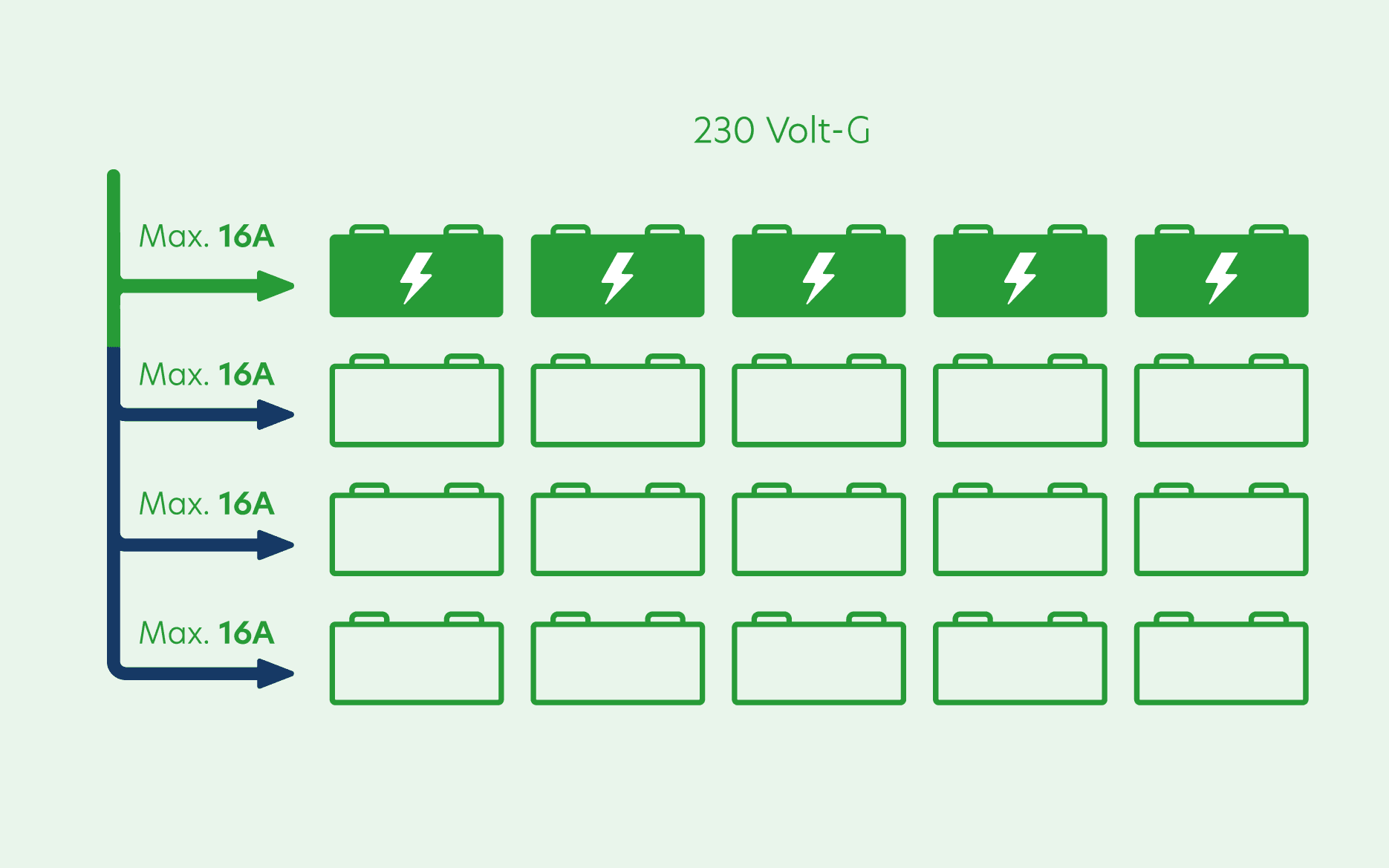 Auf dem Etikett jedes Ladegeräts ist die Stromstärke angegeben – zum Beispiel 2A oder 3,5A. Addieren Sie die Werte, um schnell herauszufinden, wie viele Ladegeräte Sie auf einer Ebene mit 5 Steckdosen anschließen können. Ein Beispiel: Sie haben Ladegeräte mit 2A + 3A + 2,5A + 3,5A + 4A = 16A. Das passt also genau auf eine Ebene.
