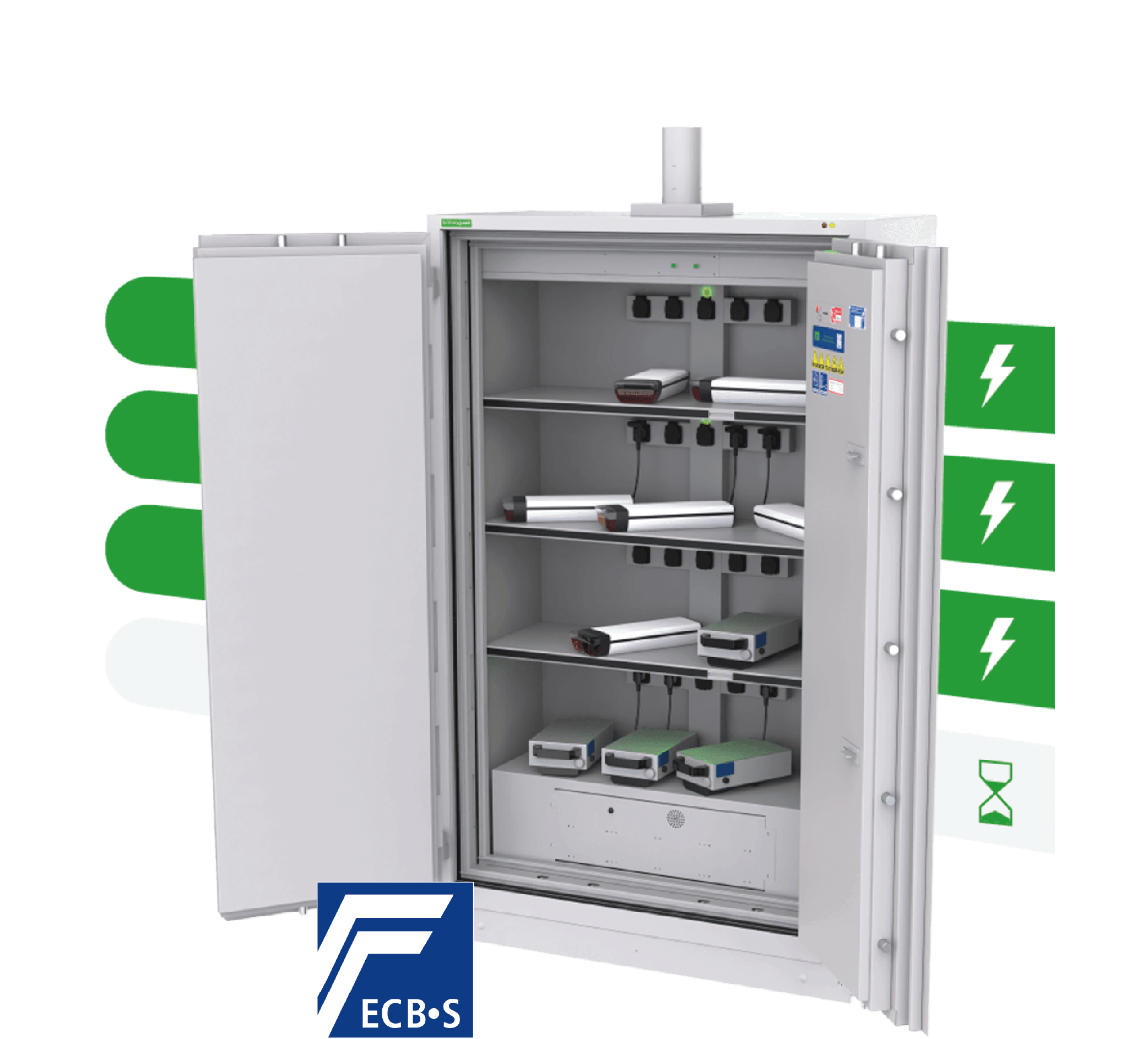This battery safe combines continuous charging and automatic switching – made possible by the ElectrIQ charging system. Three levels charge simultaneously – ideal during busy working hours. The fourth level only switches on when the third level is fully charged. The safe automatically determines what’s needed and prevents overloading your connection. Read more under Connecting many chargers? Calculate how many fit per level.