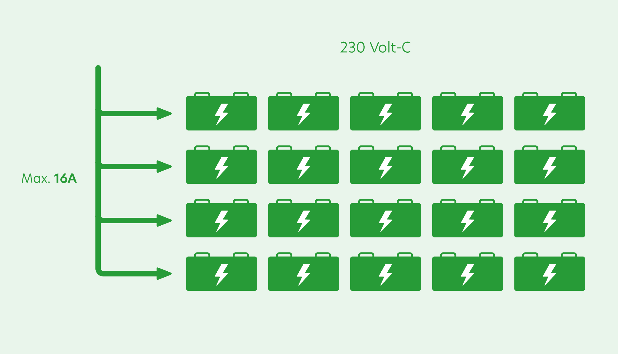 Ce coffre-fort pour batteries dispose de 20 prises et d’une capacité totale de 16 ampères. Par exemple : si vos talkies-walkies consomment chacun 0,8 ampère, vous pouvez connecter exactement 20 chargeurs simultanément.